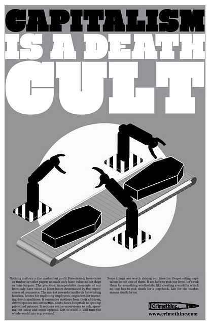 Nothing matters to the market but profit. Forests only have value as timber or toilet paper; animals only have value as hot dogs or hamburgers. The precious, unrepeatable moments of our lives only have value as labor hours determined by the imperatives of commerce. The market rewards landlords for evicting families, bosses for exploiting employees, engineers for inventing death machines. It separates mothers from their children, drives species into extinction, shuts down hospitals to open up privatized prisons. It reduces entire ecosystems to ash, spewing out smog and stock options. Left to itself, it will turn the whole world into a graveyard.